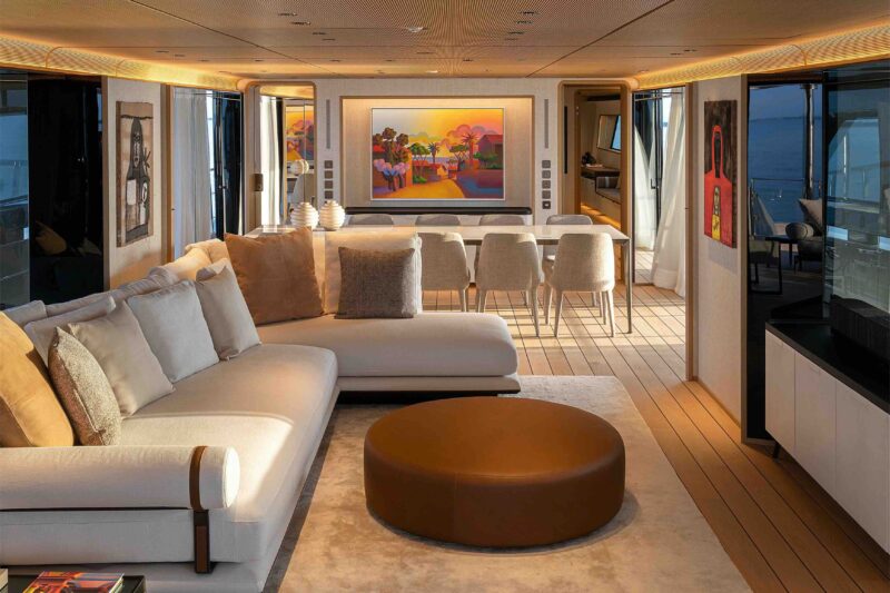 «Ho voluto una barca che non avesse colori» spiega Galassi. «All’interno ci sono sfumature e tantissime tonalità di “colori-non-colori”. I veri colori sono dati dalle opere d’arte che ci sono a bordo e dalle nuance del mare, del sole e del cielo». Alla domanda se, potendo tornare indietro al 2014, rifarebbe tutto, emerge l’indole schietta e verace di buon emiliano: «No! Non tornerei indietro a riprendere in mano Ferretti come l’avevo trovata dieci anni fa per nessuna cifra al mondo! Troppa fatica e troppa vita dedicata al lavoro.