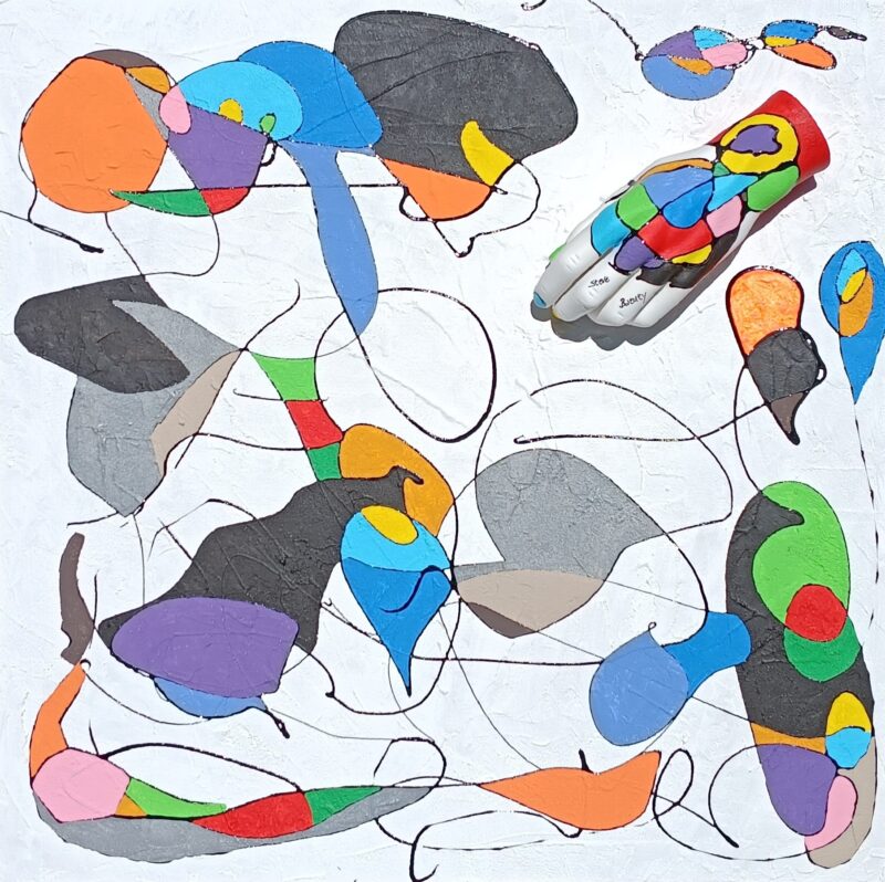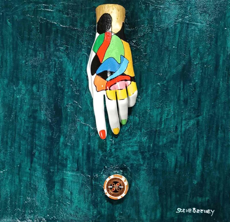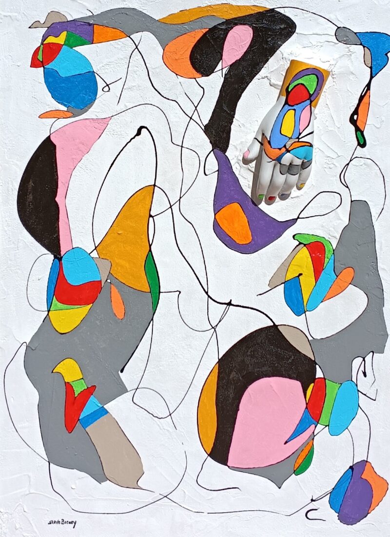 Uno degli aspetti più distintivi di Steve Barney è il suo approccio sperimentale, che mescola tecniche e stili per creare opere che sfidano le convenzioni. I “Nodi di Barney”, creati nel 2012, ne sono un esempio lampante: un intreccio di action painting ispirato a Pollock e le vivaci geometrie cromatiche di Mirò. Questa combinazione genera un dialogo tra l’energia del gesto e l’armonia del colore, coinvolgendo lo spettatore in un’esperienza multisensoriale. Barney è anche un maestro nel dare nuova vita a materiali considerati “morti”: manichini, metri da sarto, stecche da biliardo e persino palle da gioco, diventano elementi di design che trasportano l’osservatore in una dimensione in cui l’arte riflette la realtà. Questa capacità di riciclo non è solo un’operazione tecnica, ma un messaggio di rinascita e resilienza: ogni pezzo rinasce sotto le sue mani, incarnando il potenziale nascosto che Barney riesce magicamente a svelare.