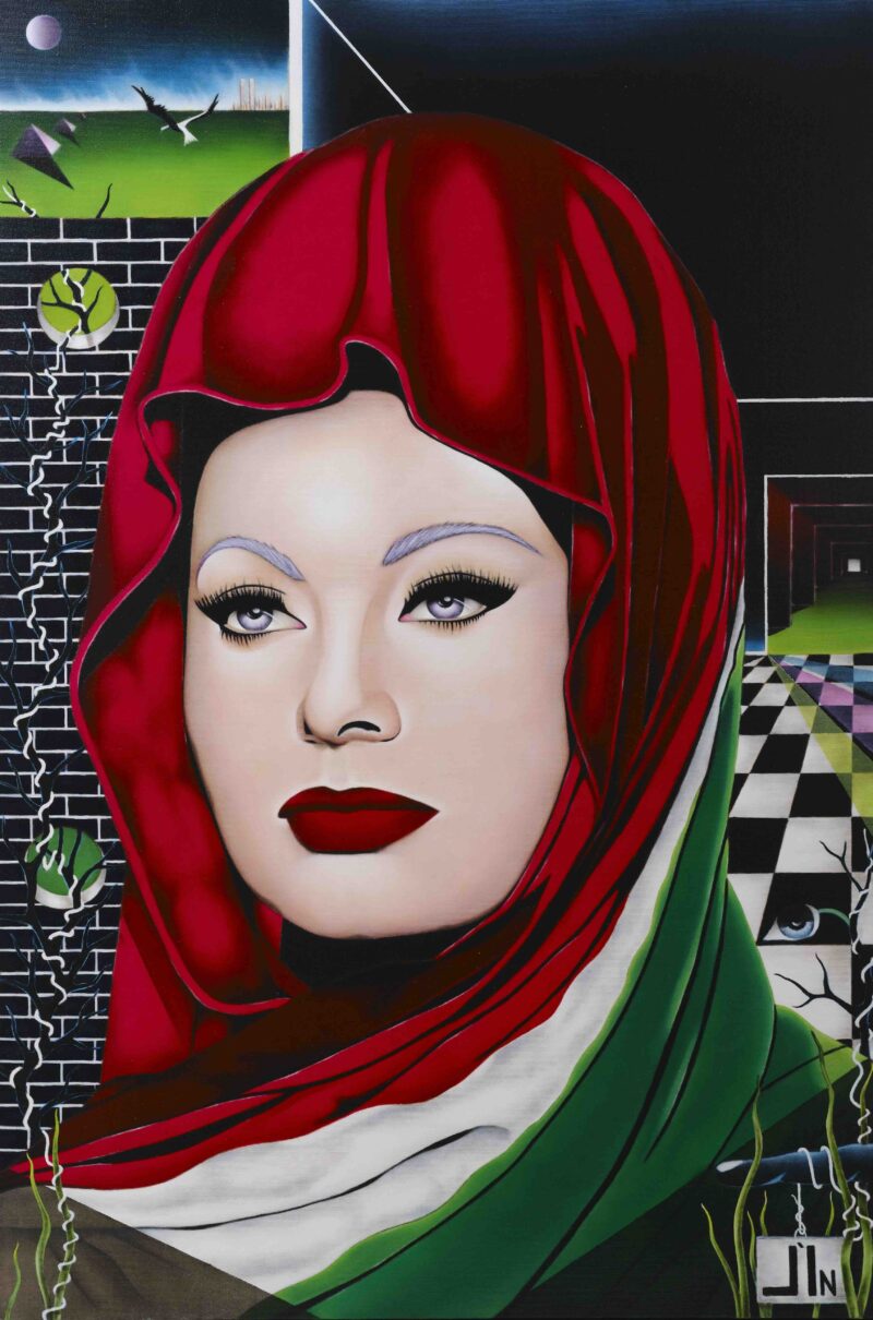 Ma se da una parte manca il volto dell’autore dall’altra si ritrovano numerosi volti ritratti dall’artista che ieratici, eleganti, intelligenti dialogano con chi li osserva. In questo senso, l’artista fa dell’’arte un territorio di libertà assoluta, uno spazio di silenzio in cui si possa incontrare sé stessi attraverso l’immagine e il colore, senza l’interferenza della persona che l’ha creato.