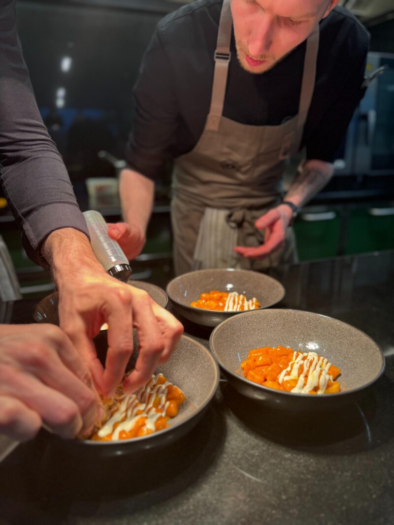Ciò che rende l’Officina Gastronomica speciale, è la possibilità di assistere alla finalizzazione dei piatti direttamente al bancone, permettendo agli ospiti di vivere un’esperienza culinaria interattiva e coinvolgente. La vicinanza dello Chef con gli ospiti aggiunge un tocco personale e autentico che rende ogni visita un’occasione unica. Il menù degustazione (che ne limita la scelta) é un viaggio culinario guidato dalla freschezza e dalla stagionalità delle materie prime, è l’incarnazione della filosofia dell’Officina.