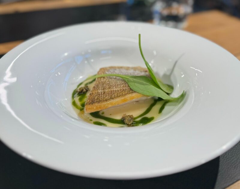 Occhione (pesce) “mi-cuit” alla mugnaia e spinacino novello