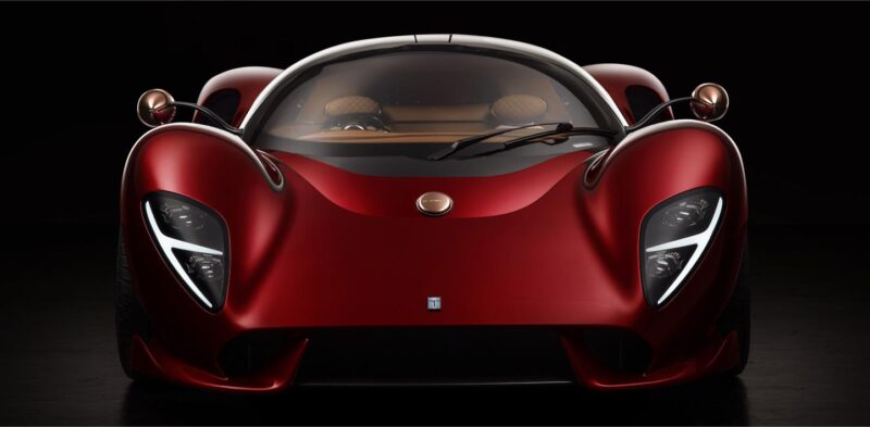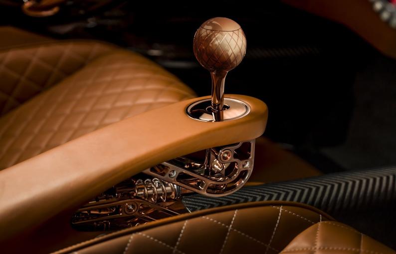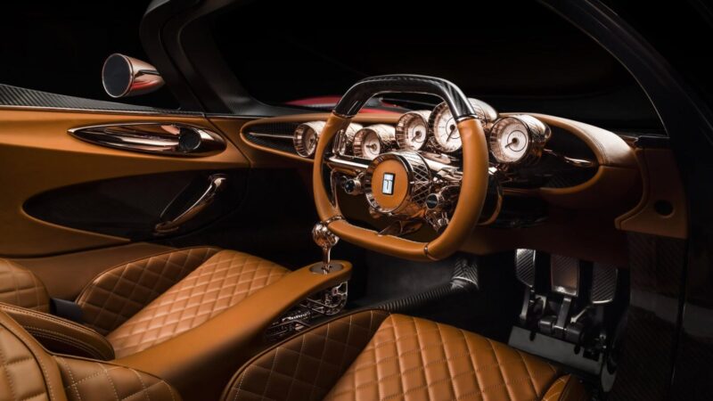 L’abitacolo è racchiuso sotto una cupola di vetro con Il parabrezza panoramico, allungato notevolmente verso il cofano anteriore, favorendo la visibilità e rendendo l’esperienza di guida immersiva e coinvolgente. Le porte con apertura ad elitra, agevolano l’ingresso in un cockpit sportivo ed elegante. Strumenti analogici e dettagli con finiture in rame molto raffinati, trattati come preziosi gioielli, selleria in pelle con lavorazioni e cuciture artigianali a diamante. La fibra di carbonio trova ampio uso per la carrozzeria ed il telaio, contribuendo notevolmente alla riduzione del peso esaltando le prestazioni.
