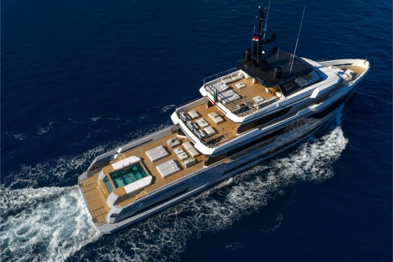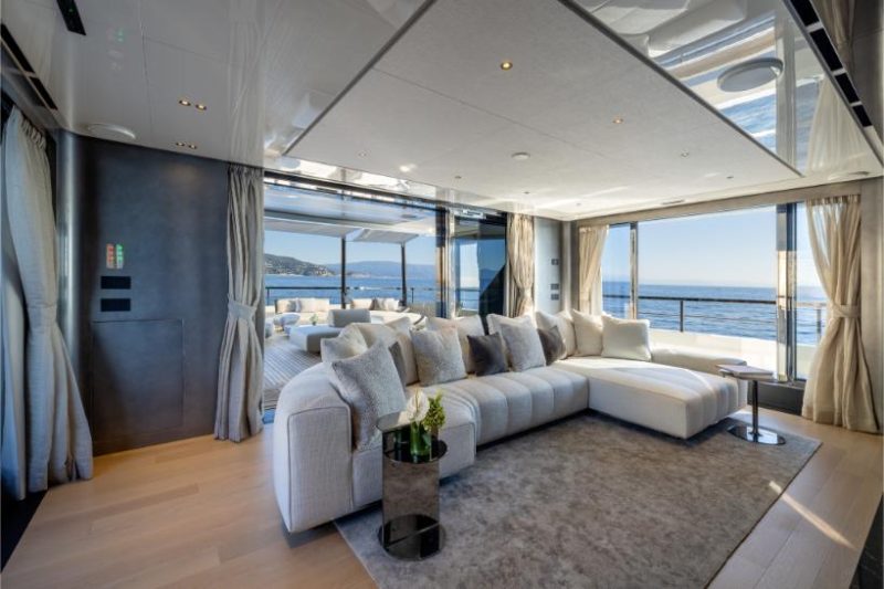 La parte più innovativa è il beach club del ponte inferiore con la scenografica piscina in vetro, che, con due metri di profondità e 17 metri cubi di acqua salata – è forse la più grande mai realizzata su imbarcazioni di queste dimensioni. La luce è fondamentale: i raggi del sole diventano “materia viva” creando suggestioni visive che mutano da mattina a sera in un’atmosfera di emozioni. La luce naturale penetra attraverso le pareti trasparenti della vasca illuminando la sala fitness sottostante, con palestra Technogym o spa e sala massaggi, a seconda della scelta dell’armatore. Gli interni sono firmati da Hot Lab, studio di progettazione milanese dall’approccio sartoriale. Nell’elegante salone principale spiccano materiali preziosi: marmo, metalli, velluti e soffici tessuti. L’armonia cromatica sofisticata è data da tonalità neutre (grigio caldo, beige, panna) ravvivate da esplosioni di colore, come l’opera d’arte pop incorniciata dal marmo.