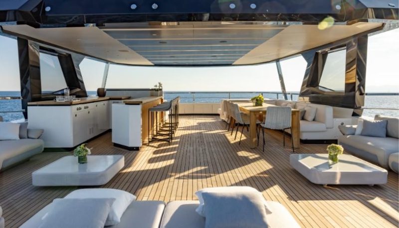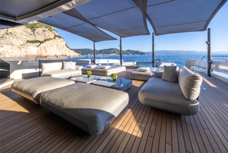 All’esterno i tre ponti di poppa offrono estesi spazi all’aperto. Il pozzetto, con parapetti abbassabili, può ospitare giochi d’acqua e un tender di sei metri manovrato da una gru incassata nella muraglia. Il pozzetto dell’upper deck è arredato con divani, sofà Minotti e maxi schermo tv. Le porte scorrevoli creano un continuum tra interno ed esterno. L’ampio sundeck (12 metri di lunghezza e 7 di larghezza) sul ponte superiore è una celebrazione en plein air e può accogliere 30 persone.