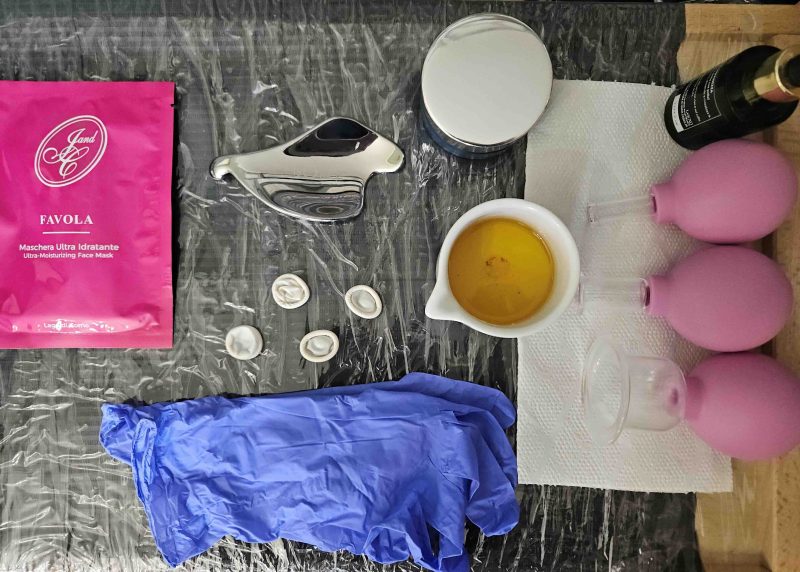 È mia abitudine spiegare, far sentire e capire ad ogni cliente il perché di ogni problematica del proprio volto, così da renderla partecipe e consapevole. Oltre a piccoli e semplici esercizi di auto-lifting che insegno ad ogni seduta per mantenere e migliorare il risultato ottenuto, un valido aiuto per distendere ed eliminare aderenze dei tessuti, solchi e gonfiori, è il kinesio taping. I tape sono nastri adesivi utilizzati da decenni da sportivi, fisioterapisti ed osteopati per la muscolatura del corpo. Sono un ottimo alleato per drenare, tonificare e liftare durante il sonno: danno un effetto botox per tutta la notte e al mattino, una volta rimossi, si stenta a credere ciò che fanno questi nastri adesivi colorati. Il punto chiave è saperli adoperare. Durante il massaggio, studio applicazioni personalizzate facili da eseguire a casa. C’è un mondo dietro queste tecniche che pratico, tutte scientificamente studiate e approvate, come anche la coppettazione facciale, l’utilizzo di blade e gua sha. Non sono invece una sostenitrice del face yoga.